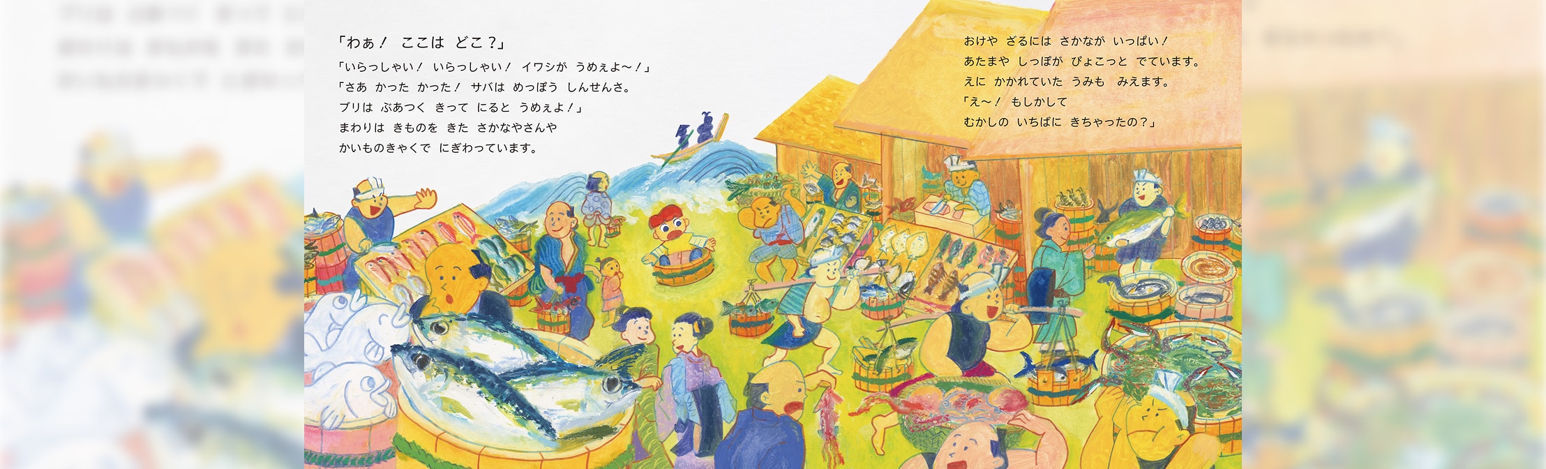 お母さんと買い物に来た魚嫌いの子ども(みなと)が、名古屋市中央卸売市場本場の2階に掲げられている絵を見ているうちに、その絵の中に吸い込まれタイムトラベルするところから物語は始まります。舞台は当時の魚市場。そこにお殿様がやってきて、いつものようにたくさんの魚を買って、市場は大賑わい。魚が苦手だと言うみなとをお城に招いて、地元で獲れる魚を使って、どのように調理され、どのように食べられてきたのかを教えてくれました。鯛や鰯、フナにタコ、蛤など、あちこちからいい匂いがしてきて、みなとは魚を食べたくなってきます。実際に食べてみると、自分が思っていたよりもずっと美味しいことに気が付きます。そして絵の中から戻ってきたみなとは、魚への苦手意識がなくなり、魚を食べたいと思うようになったというお話です。子どもたちに魚を食べることへの興味を抱かせるようなストーリーになっています。